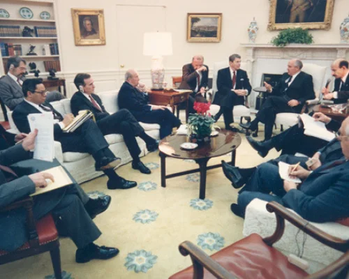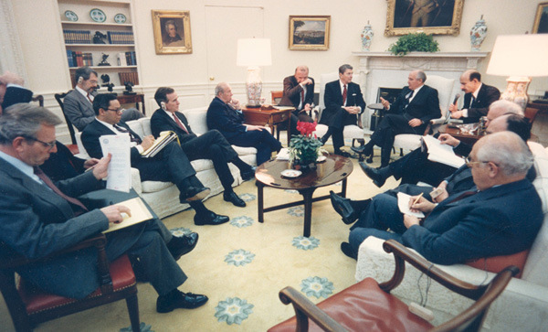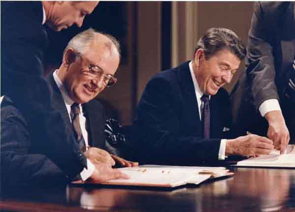 Gorbachev negotiated the The Intermediate-Range Nuclear Forces Treaty (INF) with former President Reagan in 1986 to ban all land-based missiles with ranges of 310 to 3,420 miles.