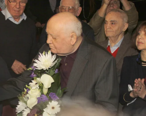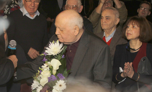Слева направо: Д.Муратов ("Новая газета"), М.С.Горбачев, В.Л.Шейнис, К.К.Карагезьян (пресс-служба Горбачев-Фонда), О.Здравомыслова (исполнительный директор Горбачев-Фонда)
