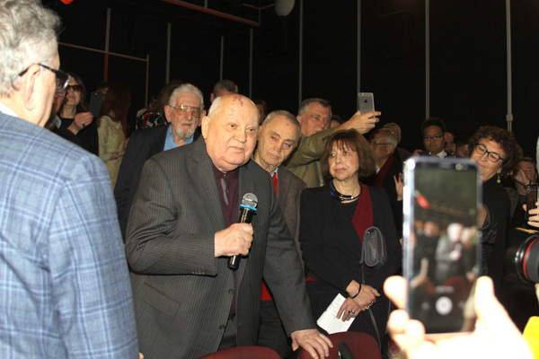 The frail 87-year-old was physically helped by aides to a cinema hall to watch the premiere in Russia of a new documentary about his life, his Soviet reforms in the 1980s and his arms control drive that helped end the Cold War.