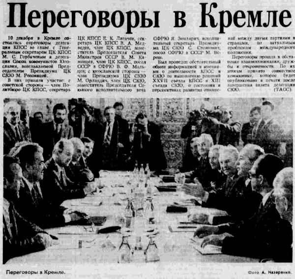 10 декабря в Кремле состоялись переговоры делегации КПСС во главе с Генеральным секретарем ЦК КПСС М.С. Горбачевым и делегации Союза коммунистов Югославии[10], возглавляемой Председателем Президиума ЦК СКЮ М. Реновицей.
