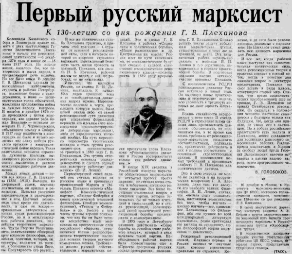 11 декабря в «Правде» опубликована статья В. Голобокова «Первый русский марксист». К 130-летию со дня рождения Г.В. Плеханова.