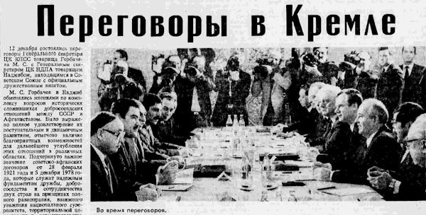 12 декабря в Кремле состоялись переговоры М.С. Горбачева с Генеральным секретарем ЦК Народно-демократической партии Афганистана Наджибом.