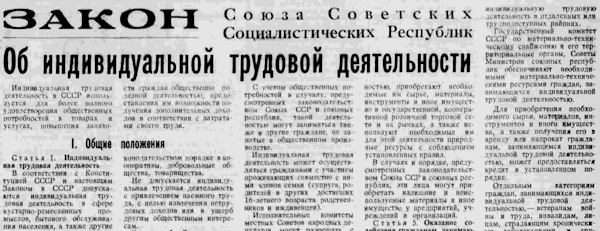 - В «Правде» опубликован Закон Союза Советских Социалистических Республик «Об индивидуальной трудовой деятельности»
