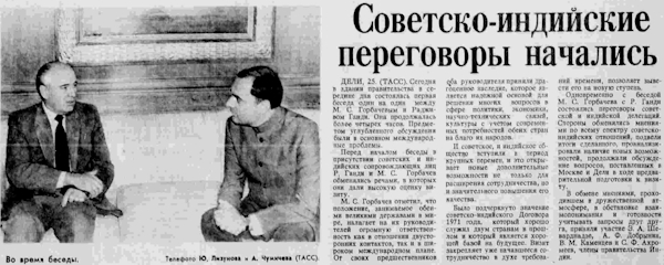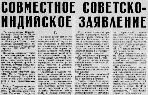 28 ноября в «Правде» опубликовано Совместное советско-индийское заявление по итогам переговоров М.С. Горбачева и Р. Ганди.