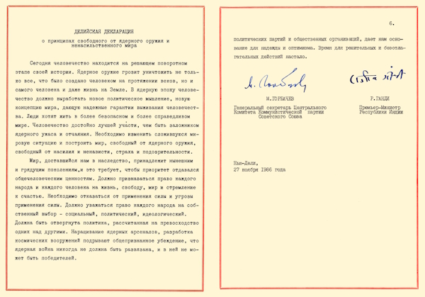 Из мемуаров М.С. Горбачева «Жизнь и реформы»: «Делийская декларация является выдающимся документом, значение которого не ограничивается рамками исторического момента. Он общезначим и актуален сегодня, как и вчера».