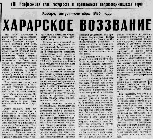 [4] Конференция проходила 1-6 сентября 1986 года. «Харарское воззвание» вручено М.С. Горбачеву министром иностранных дел Республики Зимбабве У. Мангвенде 8 октября 1986 года в Москве.