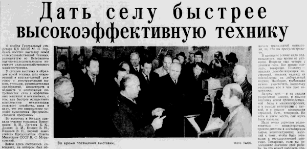 4 ноября М.С. Горбачев посетил выставку новой сельскохозяйственной техники, развернутую во Всесоюзном научно-исследовательском институте сельскохозяйственного машиностроения[6].