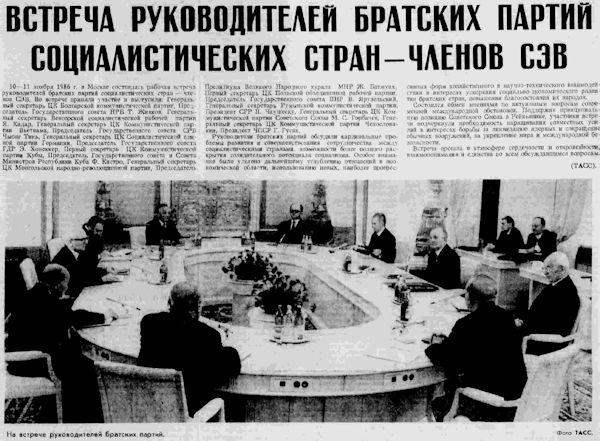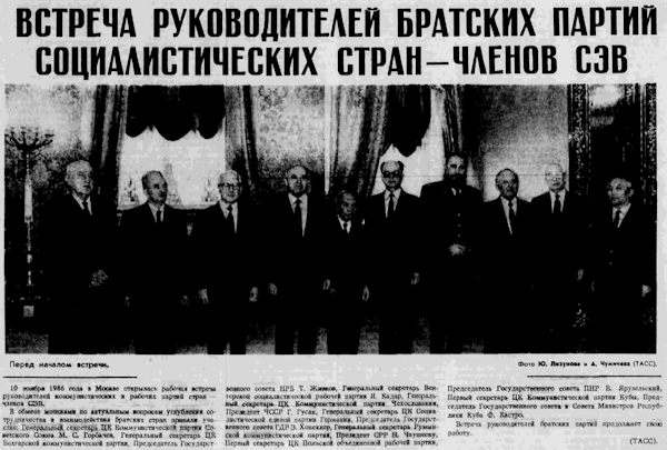 11 ноября в Москве завершилась рабочая встреча руководителей коммунистических и рабочих партий стран - членов СЭВ[15]. «Руководители братских партий обсудили кардинальные проблемы развития и совершенствования сотрудничества между социалистическими странами… Состоялся обмен мнениями по актуальным вопросам современной международной обстановки».