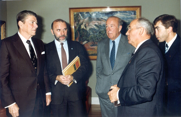 Рейкьявик. Р. Рейган, Д.М. Заречняк (переводчик Р. Рейгана), Дж. Шульц, М.С. Горбачев, Н.Н. Успенский