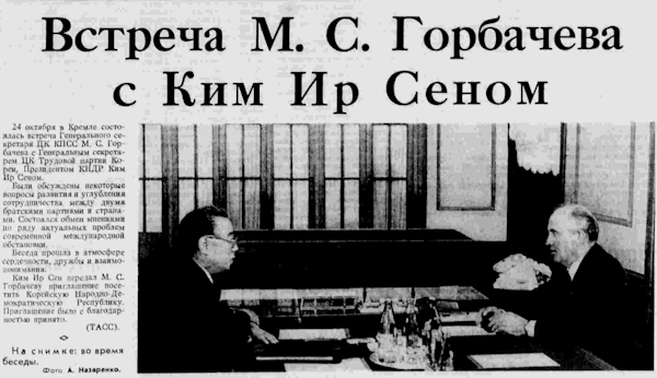 22 октября по приглашению Генерального секретаря ЦК КПСС М.С. Горбачева в Москву с дружественным визитом прибыл Генеральный секретарь ЦК Трудовой партии Кореи, Президент Корейской Народно-Демократической Республики Ким Ир Сен.