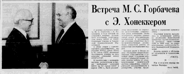 «Состоялся обстоятельный разговор об узловых проблемах борьбы за ускорение социально-экономического развития страны, о ходе перестройки, всех сферах общественной жизни, реализации решений XXVII съезда КПСС. Участники встречи отмечали, что курс партии на перестройку, ее последовательная и конструктивная внешняя политика находят полную поддержку советского народа. «Правда», 24 октября 1986 г.
