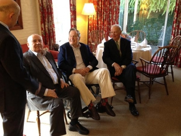 Former Secretary of State James Baker, right, points out a page in former President of the Soviet Union Mikhail Gorbachev's, left, book to former President George H.W. Bush, center, before their lunch Thursday, Nov. 1, 2012, in Houston. © AP
