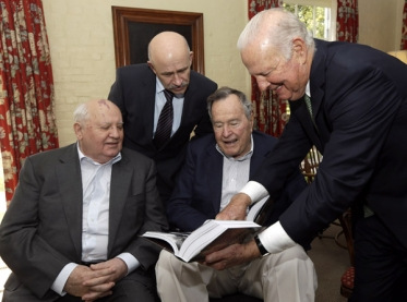 Left to right: Pavel Palazhchenko, interpreter, former President of the Soviet Union Mikhail Gorbachev, former President George H.W. Bush, former Secretary of State James Baker. © AP.