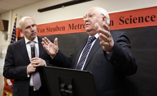Former Russian President Gorbachev, with his interpreter, speaks with students at Frederick Von Steuben Metropolitan Science Center in Chicago. Apr 23, 2012.Photo By JEFF HAYNES/REUTERS