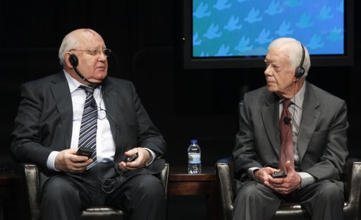 Former Soviet leader Gorbachev talks as former U.S. President Carter listens during the 12th World Summit of Nobel Peace Laureates in Chicago. Apr 23, 2012. Photo By JEFF HAYNES/REUTERS