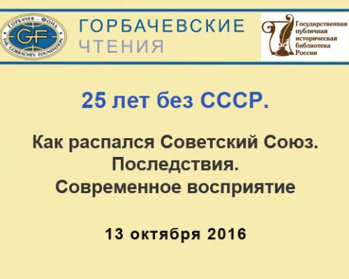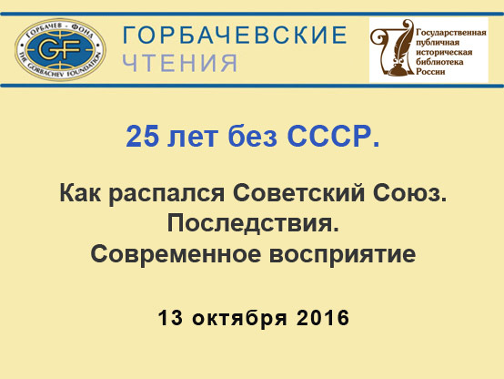 13 октября состоялась конференция «25 ЛЕТ БЕЗ СССР. Как распался Советский Союз. Последствия. Современное восприятие». Конференция прошла в рамках проекта Горбачевские чтения и была организована Международным фондом социально-экономических и политологических исследований (горбачев-Фонл) совместно сГосударственной публичной исторической библиотекой России.