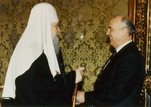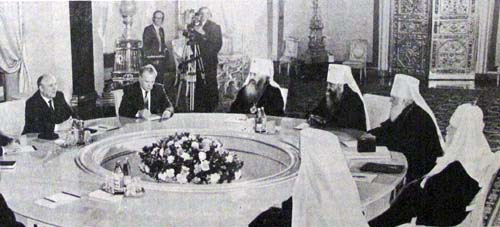 М.С. Горбачев заявил на встрече о разработке нового закона о свободе совести. В ответном слове Патриарх Пимена сказал: «Глубокоуважаемый Михаил Сергеевич, от имени епископата, клира, монашествующих и мирян нашей церкви — граждан нашей социалистической Родины, выражаю Вам — архитектору перестройки и провозвестнику нового политического мышления — всецелую поддержку этому благотворному процессу. Мы, церковные люди, горячо молимся об успехе этого процесса и стремимся сделать все возможное для его развития»[v].