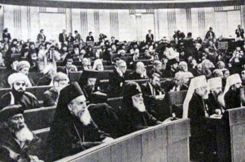 Интересно, что Совет Министров СССР направил делегатам Поместного Собора приветствие, в котором «с удовлетворением» отмечалось, что «между церковью и государством существуют нормальные отношения. Подавляющее большинство духовенства и верующих граждан — патриоты своей страны, всем сердцем они воприняли осуществляемую в нашей перестройку, новые подходы к государственно-церковным отношениям в условиях перестройки и демократизации. Как отметил Генеральный секретарь ЦК КПСС М. С. Горбачев, у нас общая история, одно Отечество и одно будущее»[vii].