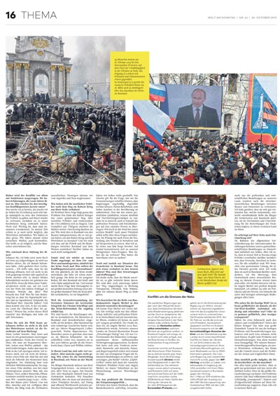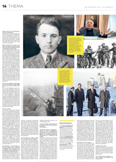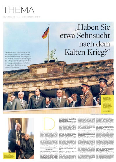 20 октября 2019 года, немецкая газета «Вельт ам зонтаг» опубликовала на нескольких полосах интервью Михаила Сергеевича Горбачева, которое он дал издателю газеты, известному немецкому журналисту Штефану Аусту. Поводом для интервью стало 30-летие со дня падения берлинской стены, которое широко отмечается не только в Германии, но и в Европе и во многих странах мира.