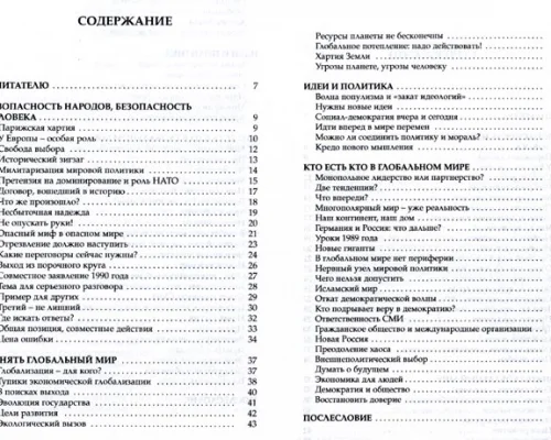 Это касается и экономической модели развития, и демократии, и отношения к окружающей среде. Горбачев предупреждает о нарастающей милитаризации международных отношений, создающей огромную угрозу будущему человечества. В центре его внимания кризис доверия между Россией и Западом, который необходимо преодолеть в обоюдных интересах.