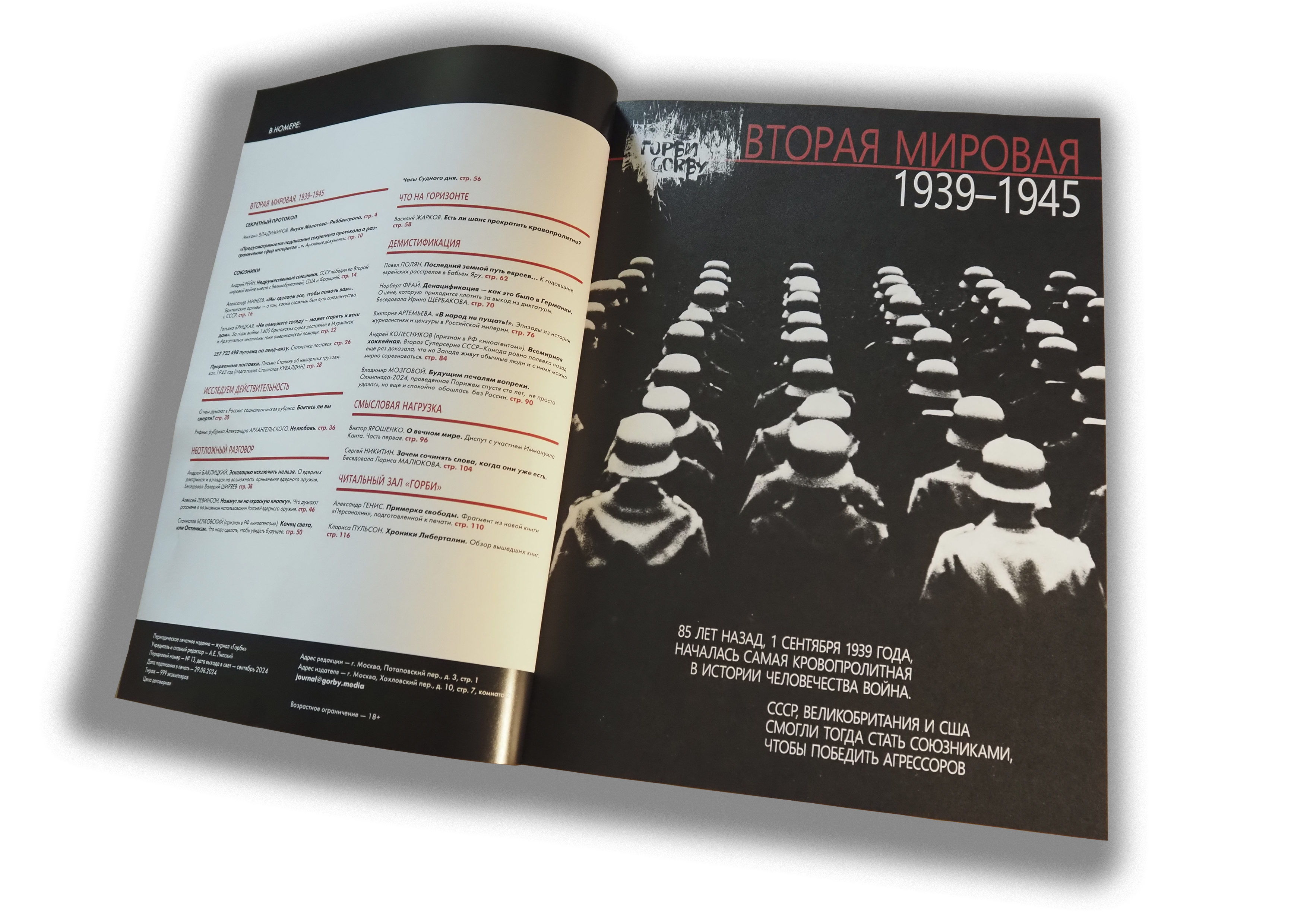 Сентябрьский номер журнала «Горби» посвящен годовщине начала Второй мировой войны. 85 лет назад Советский Союз, Великобритания и США смогли объединиться, чтобы победить агрессоров. Михаил Владимиров, Андрей Рейн, Александр Минеев и Татьяна Брицкая в своих материалах исследуют историю сотрудничества в исключительных обстоятельствах – от провала переговоров CCCР, Великобритании и Франции в Москве в августе 1939 года и заключения договоров между СССР и Германией (в том числе пакта Молотова-Риббентропа) до совместной борьбы с гитлеризмом в ходе Второй мировой войны и поставок союзниками миллионов тонн помощи, зачастую с отчаянным риском для конвоев. В статьях приведены выдержки из документов, хранящихся в отечественных и зарубежных архивах.