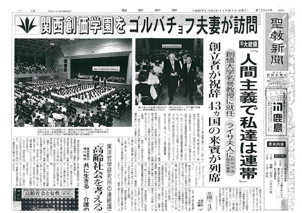 В Кансай Сока Гакуэн госпожа Раиса Горбачева произнесла мощную речь, сказав, в частности, следующее: «В жизни нас иногда глубоко ранят. Бывает, что раны так и не заживают до конца. Не все наши мечты сбываются. Но всегда есть то, чего мы можем достичь! Всегда есть мечта, которую мы можем осуществить! В конечном итоге побеждает тот, кто, даже упав, встает и снова идет вперед. Смерть не приходит к усталым. Она приходит к тем, кто перестал двигаться. Сможем ли мы продолжать борьбу или нет, определяется сердцем!»