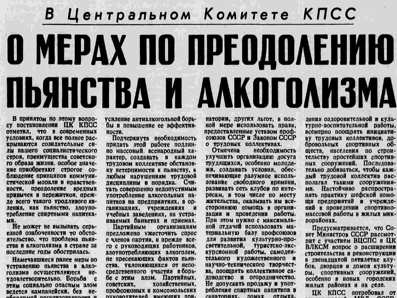 Газета «Правда сообщала: «Учитывая многочисленные предложения трудящихся, поступающие в центральные и местные органы, Политбюро всесторонне обсудило вопрос о борьбе с пьянством и алкоголизмом. Рассматривая преодоление этого уродливого явления как социальную задачу большой политической важности, ЦК КПСС одобрил комплекс крупных социально-политических, экономических, административных, медицинских и других мер по усилению борьбы с пьянством и алкоголизмом и устранению их из жизни нашего общества. Особо подчеркнута необходимость последовательного проведения в жизнь мероприятий по борьбе с пьянством, объединения и постоянной координации в этих целях усилий государственных и хозяйственных органов, партийных и общественных организаций, широкого развертывания антиалкогольной пропаганды. Одобрены предложения по совершенствованию законодательства, направленного на борьбу с пьянством, и система мер, которые будут проводиться с этой целью Советом Министров СССР, министерства ми, ведомствами, правоохранительными органами» («Правда», 5 апреля) .